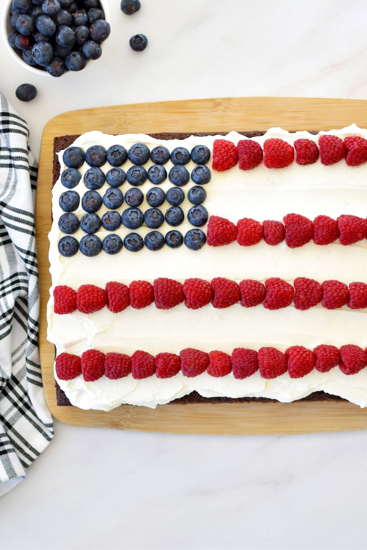 - To assemble: Add the Whipped Cream Frosting on top of the cake and spread evenly. Starting at the left corner, add 7 blueberries in a row. Then add 4 more rows of 7 blueberries to create the blue square of the flag. Next, add a row of raspberries starting at the top row where the blueberries end. The first row of raspberries will go to the end of the frosting. Next, add a second row of raspberries at the last row of blueberries. Last, add 2 more rows of raspberries spaced evenly on the bottom portion of the cake.