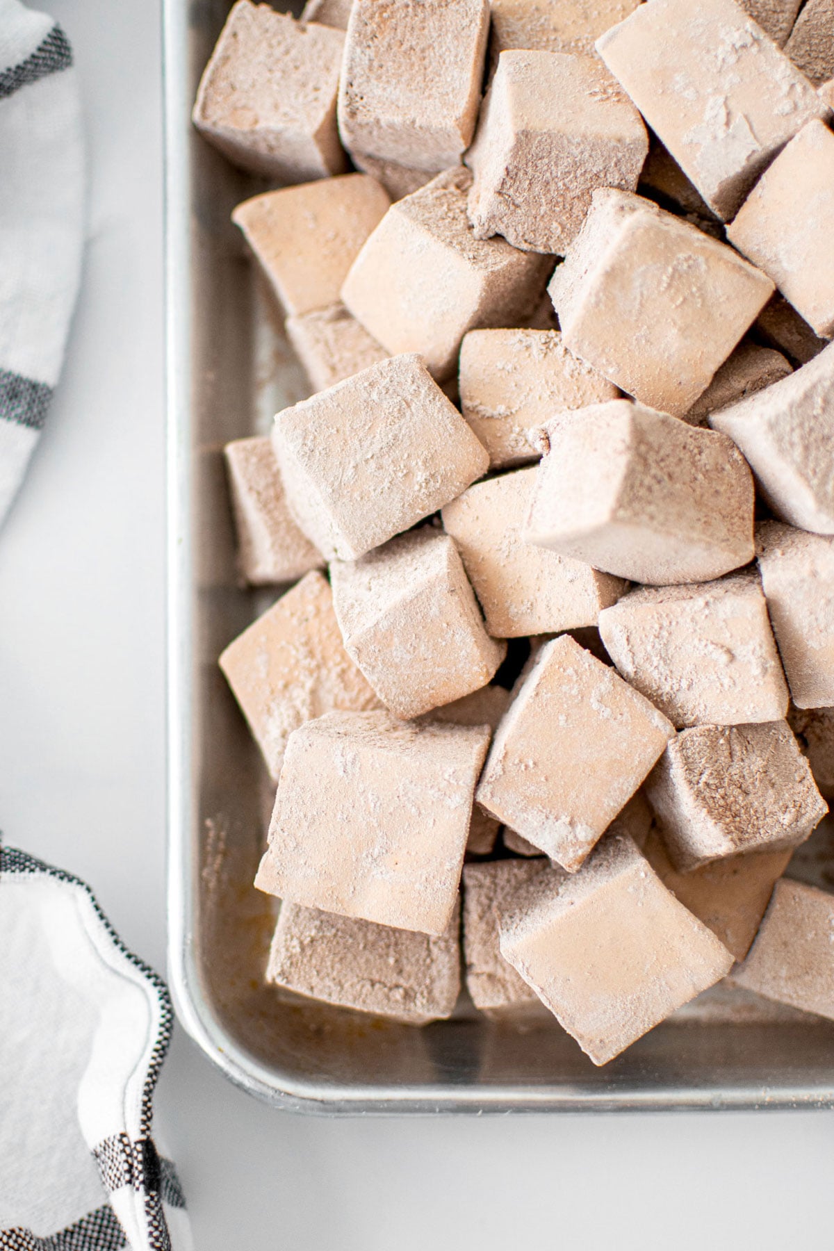 - In a sifter, add the powdered sugar and cocoa. On a baking sheet with parchment paper, or a work surface, sift some of the powdered sugar and cocoa mixture onto the parchment paper. Slowly pull at the ends of the marshmallow that are not against the parchment paper so it’s not stuck to the pan. Lift the entire marshmallow out of the pan and turn it upside down onto the powdered sugar and cocoa mixture. And sift the remaining on top.