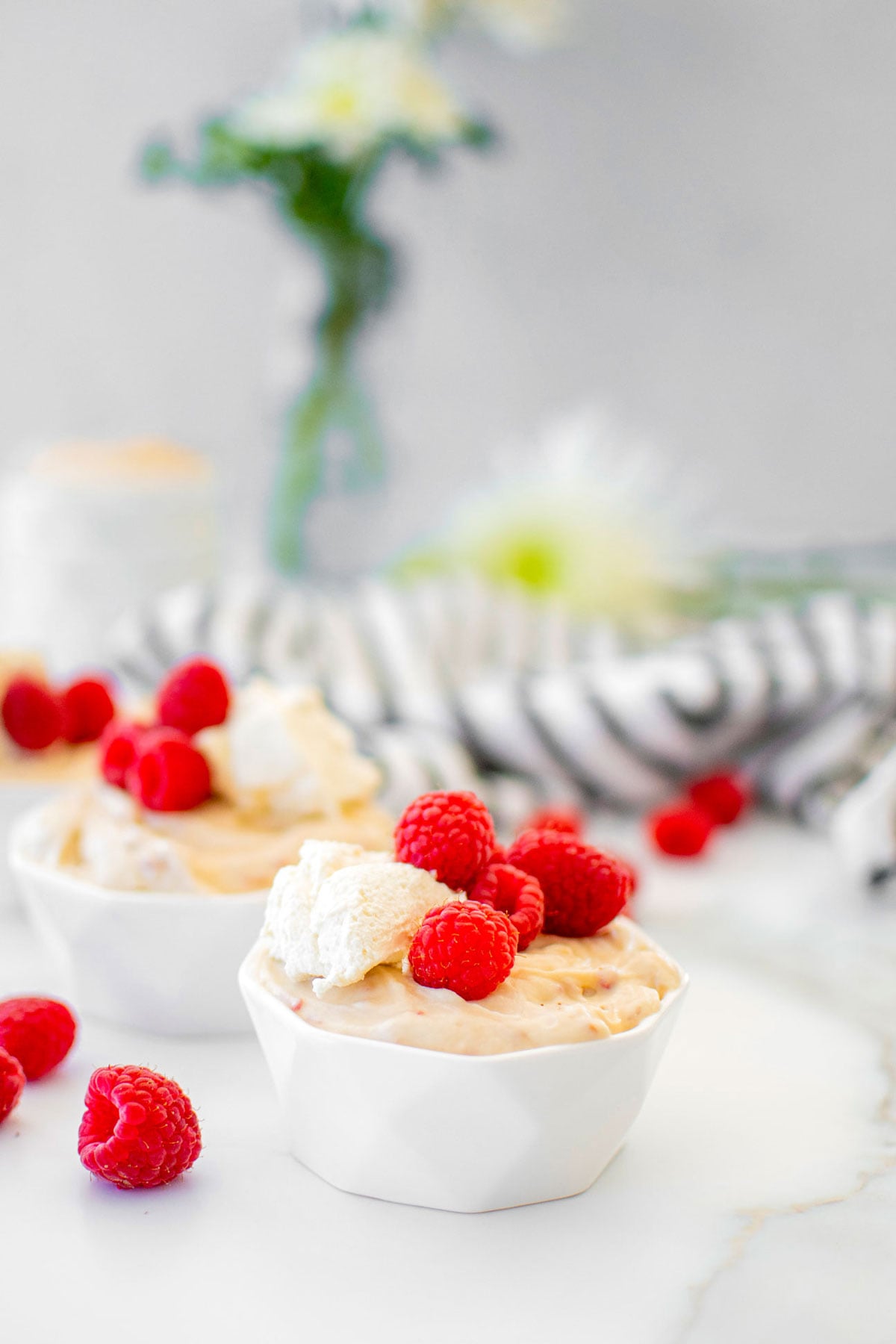 - To serve: Add the custard into small dishes, top with a little dollop of whipped cream, and fresh raspberries.