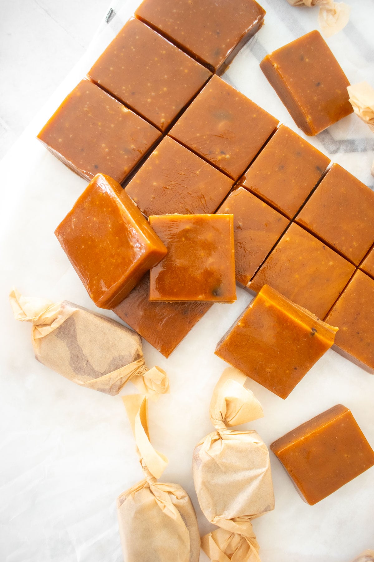 The wrong ratio of ingredients can cause caramels to be too soft (too much liquid/cream). This can happen if you don’t measure ingredients properly. Be sure to weigh ingredients and measure properly as it’s key to ensuring these caramels come out correctly.