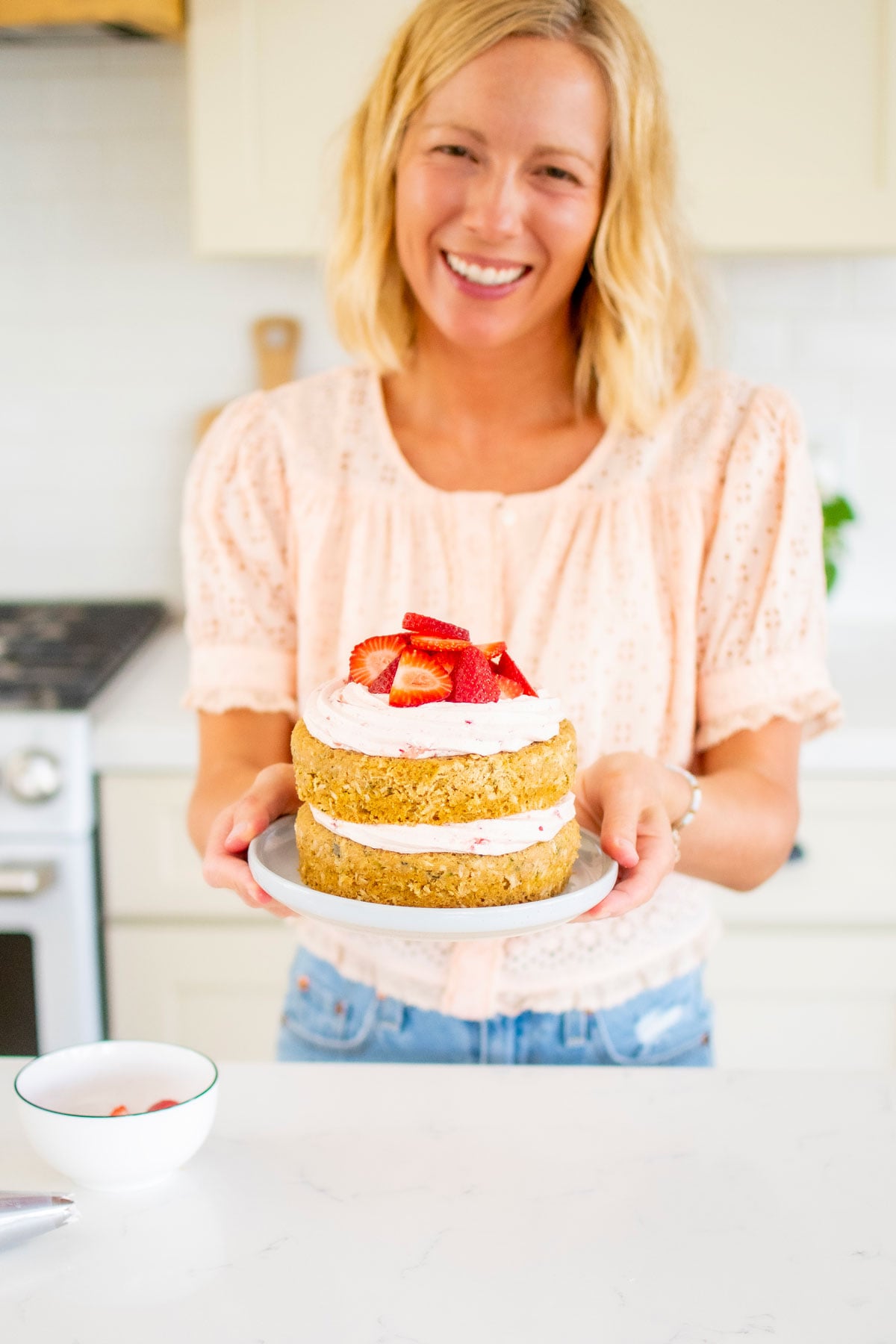 The biggest tip is don’t skimp on the frosting. If you don’t have enough frosting, this style of naked cake can look lackluster. So just make sure you generously put enough frosting on each layer. You can weigh your frosting and then divide it by two or three, depending on how many layers you have. This will ensure you get equal amounts on each layer.
