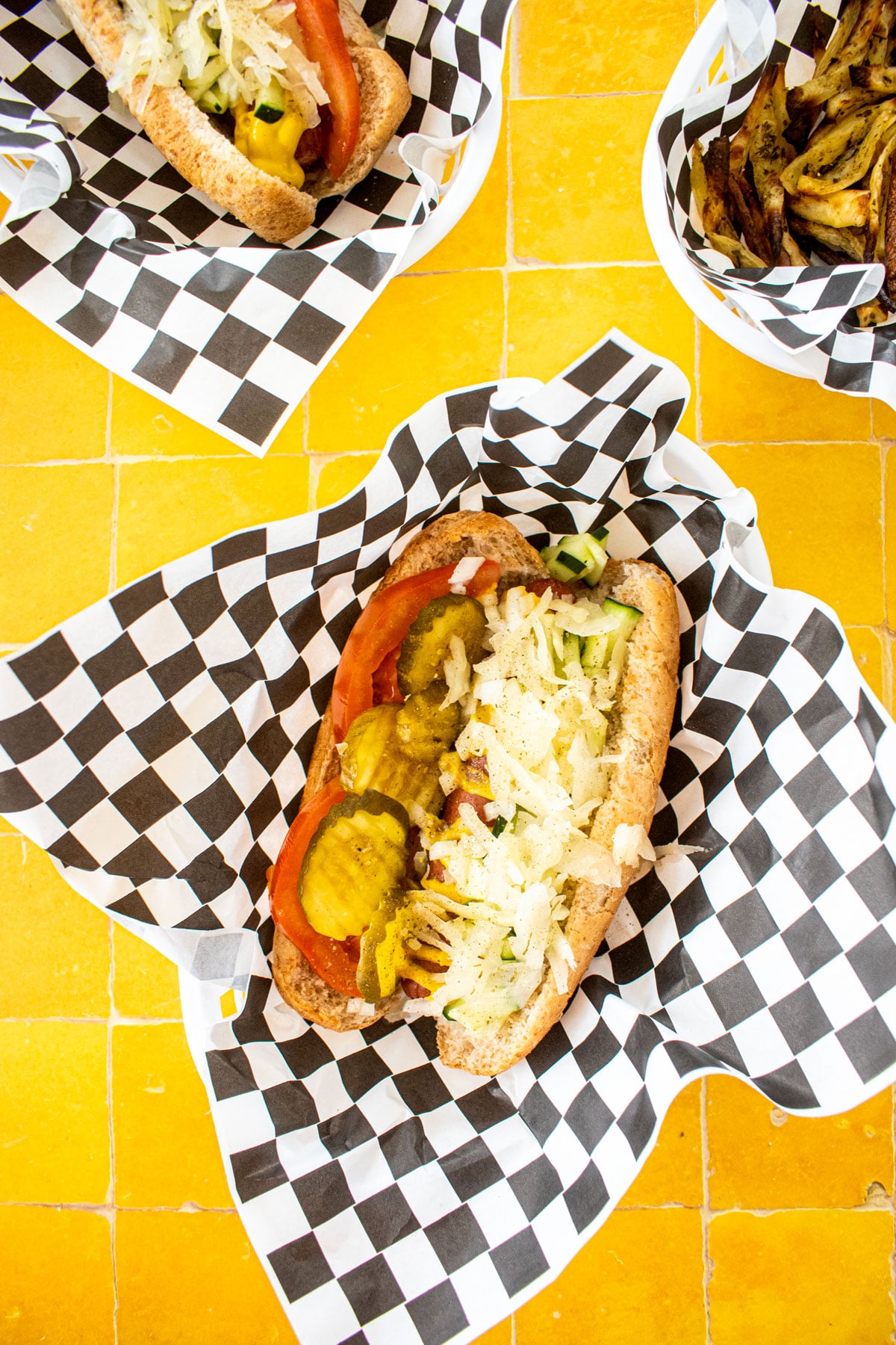 The traditional toppings include: yellow mustard, white onions, sweet relish, a dill pickle spear, tomato slices, Sport peppers, and a sprinkle of celery salt. The celery salt is one of the key ingredients (in my opinion) and it made its way onto the famous hot dog as a result of many north side celery farms.