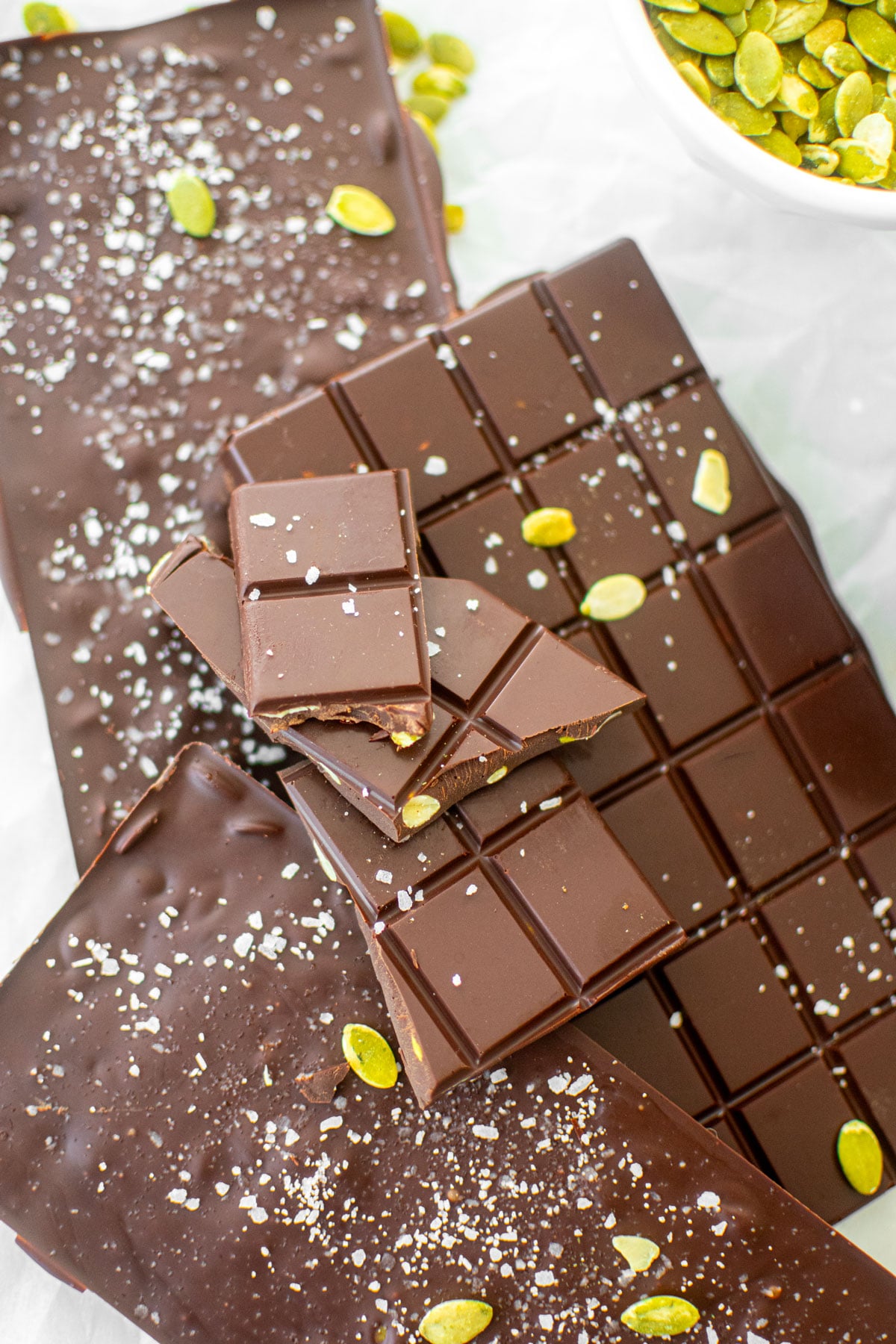 - Healthy-ish: I love desserts that are healthy-ish like Homemade Caramel Sauce with Bone Broth. While these Pumpkin Chocolate Bars are definitely indulgent, they are also a healthier dessert option because they are made of dark chocolate and pumpkin seeds.