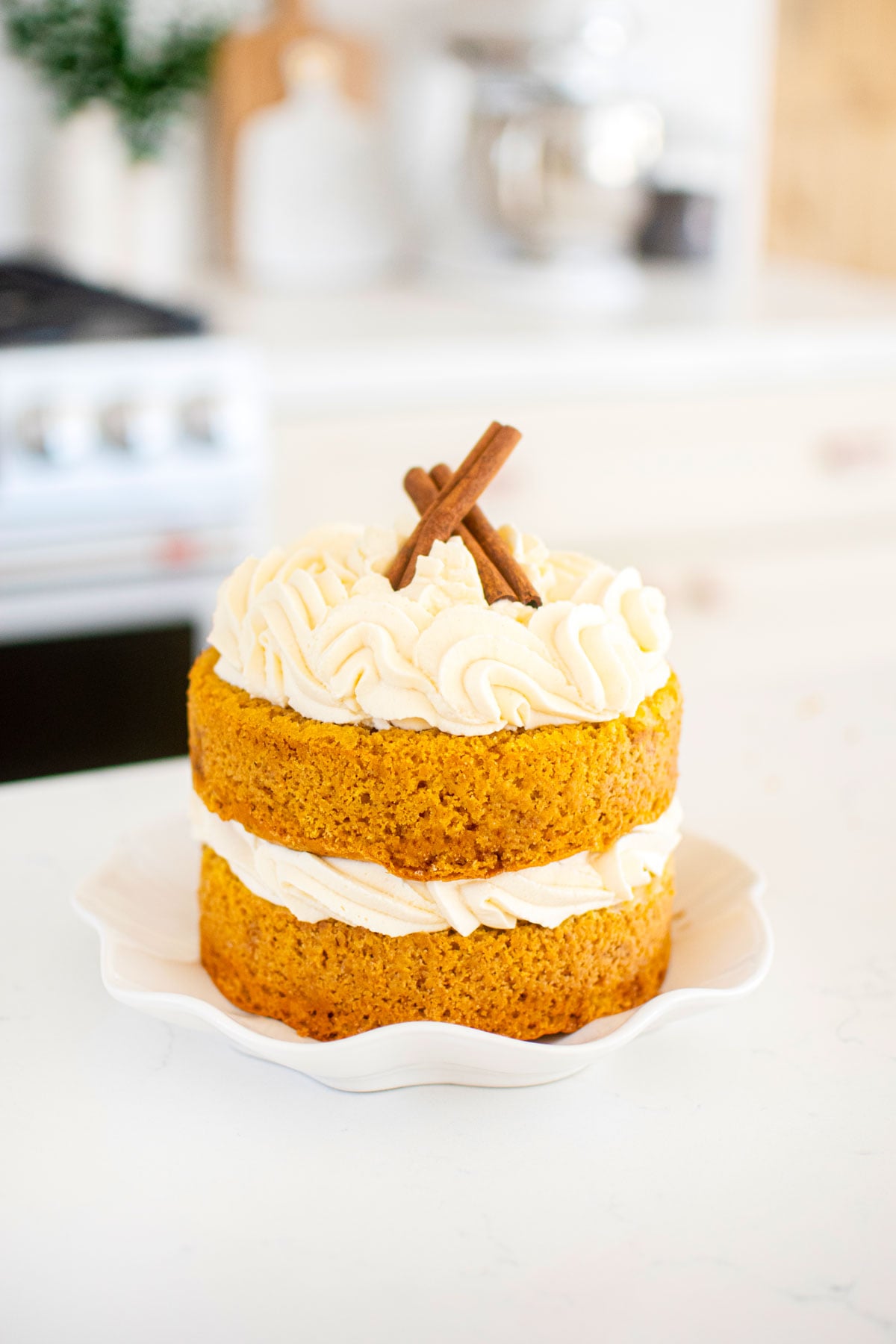 - Preheat the oven to 350°F. Line two 6-inch cake pans with parchment paper. To make the batter: In the bowl of a stand mixer fitted with the paddle attachment, add the butter, cane sugar, pumpkin spice, and vanilla extract. Mix on low until combined and there are no butter chunks.