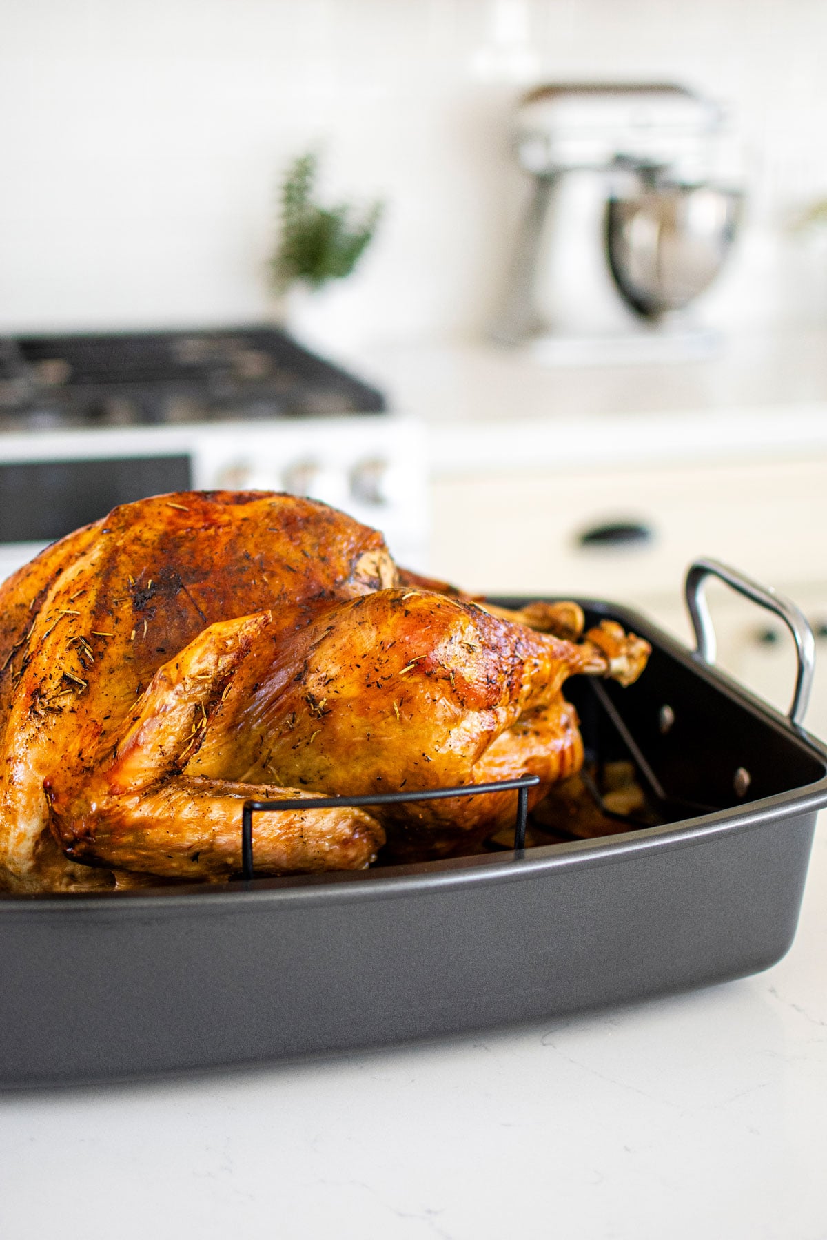 - Use a roasting pan to ensure your skin is golden brown. If you bake turkey in just a baking dish or pot, the bottom may not brown as well as the rest of it. I have the Cuisinart Roasting Pan and I love it!