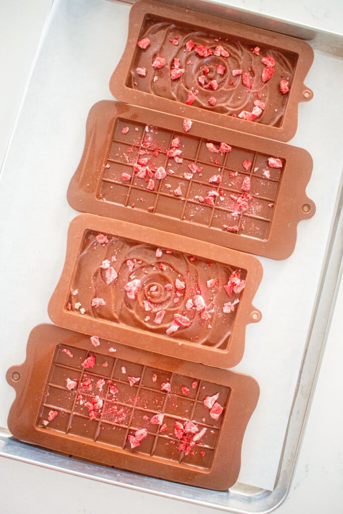 - Transfer the baking sheet to the freezer to set the chocolate. This will only take about 30 minutes. Remove the chocolate bars from the molds and enjoy!