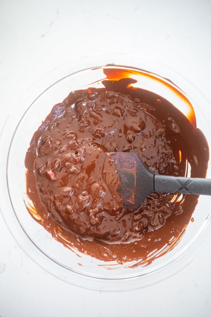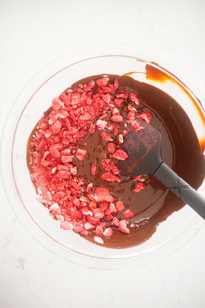 - Once the chocolate is melted (and/or tempered) add in the remaining strawberries to the chocolate and stir to combine completely.