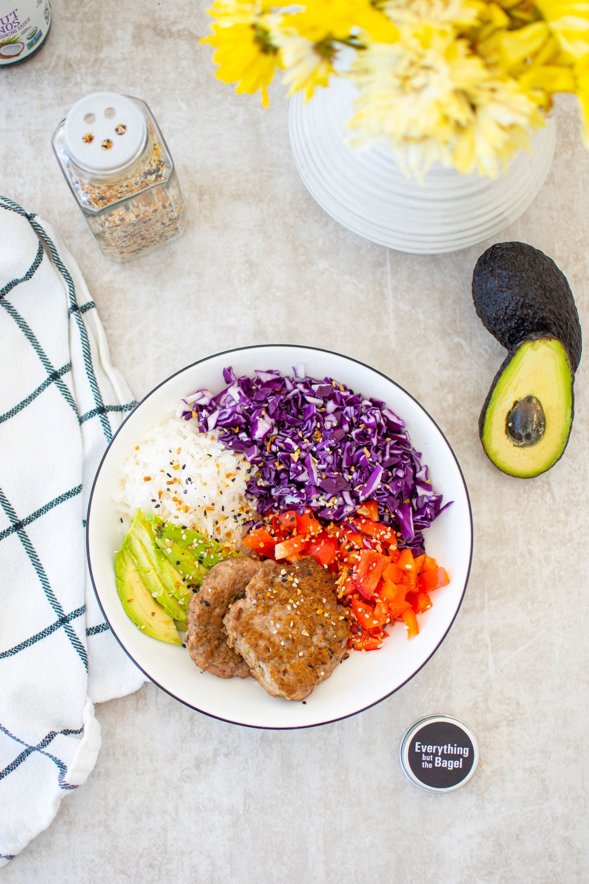 This Turkey Avocado Brunch Bowl starts with my homemade Everything Bagel Turkey Breakfast Sausages. I add avocado, red pepper, cabbage, rice, coconut aminos and everything bagel spice mix for a simple and insanely delicious and easy brunch bowl!